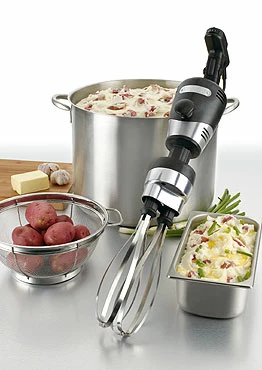 Whether used to whip delicate egg whites, cream or mashed potatoes, the Waring WSBPPW Big Stix Whisk provides consistent results. Featuring a heavy duty 1 HP motor with 1,600 RPM on high, this unit mashes up to 50 pounds of potatoes in under a minute.